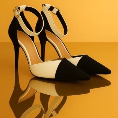 Scarpin feminino de bico fino com salto agulha 8cm, bicolor com fivela, modelo fashion